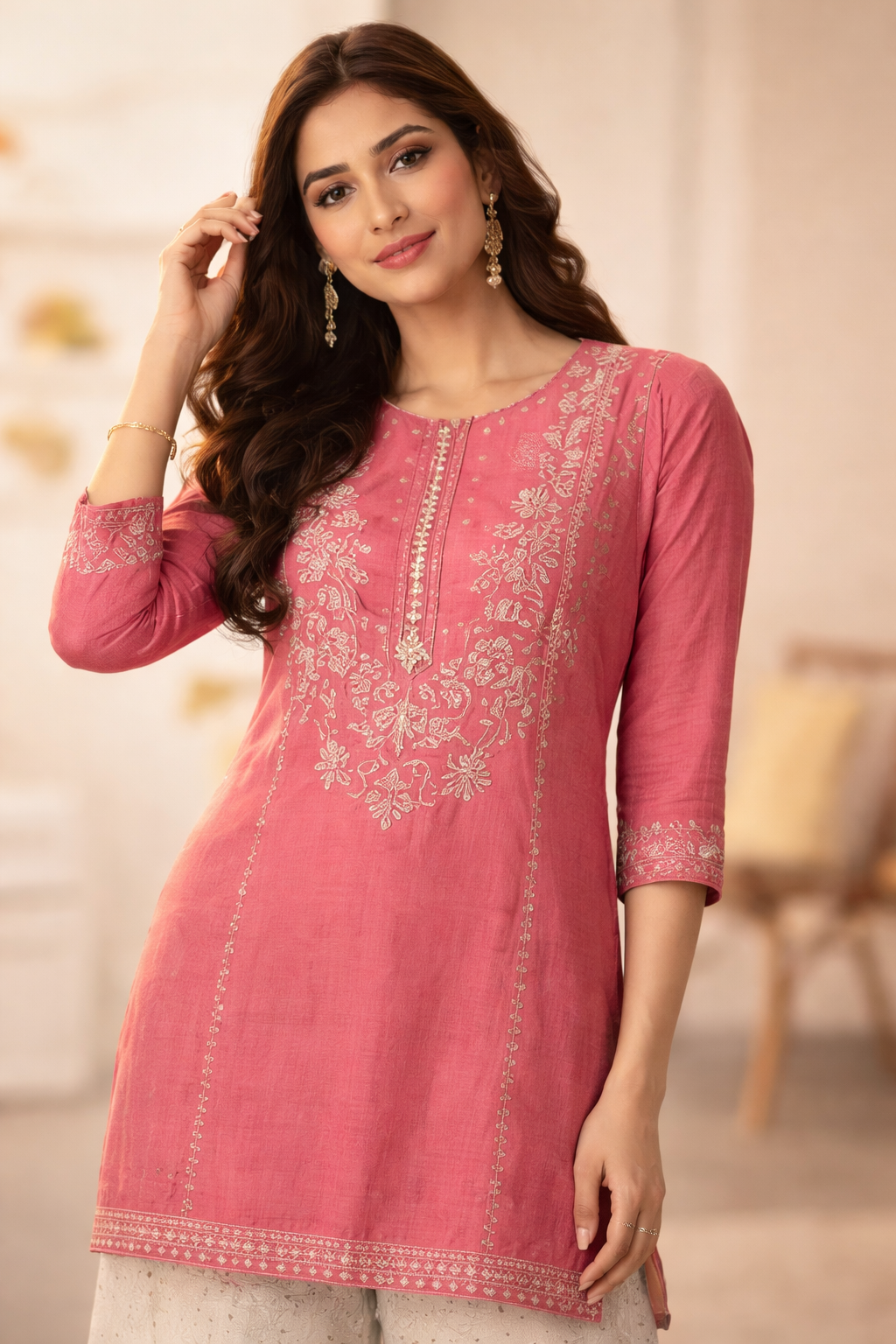 Stylish Pink Embroidered Kurti Set with Dupatta