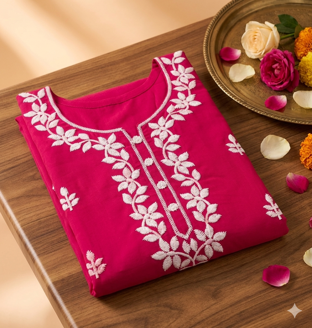 Make a bold style statement with this vibrant pink kurti set, designed to add elegance and charm to your ethnic collection. Featuring intricate white embroidery, this set includes a straight-fit kurti, matching pants, and a soft dupatta. Perfect for festive occasions, family gatherings, or casual wear, it offers both comfort and eye-catching style.